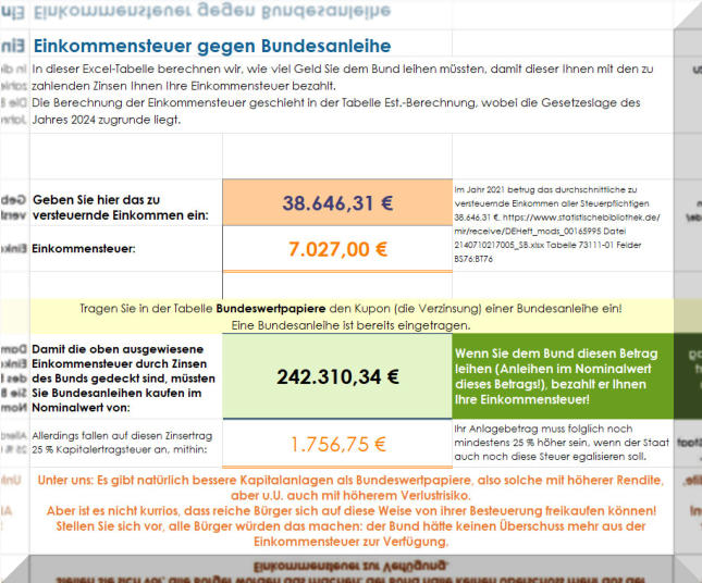 Wir haben uns den Spaß gemacht, einmal eine Excel-Mappe zu erstellen, die uns berechnet, wie viel Geld wir dem Staat leihen müssten, damit er uns